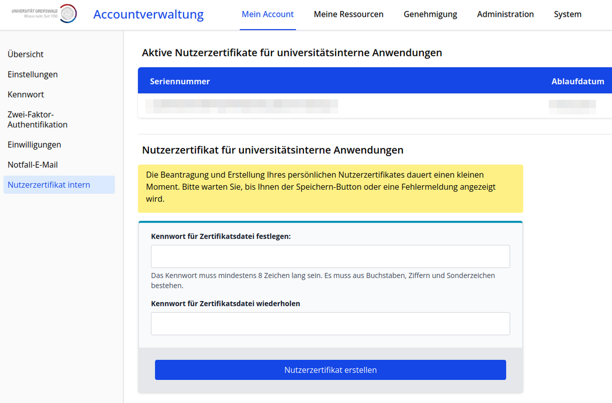 Nutzerzertifikate für interne Anwendungen (z.B. VPN) werden Ihnen über die interne Zertifizierungsstelle des URZ bereitgestellt. Die Beantragung erfolgt über die Accountverwaltung. Über das Menü gehen Sie bitte zu "Mein Account" > "Nutzerzertifikat intern" (direkter Link).