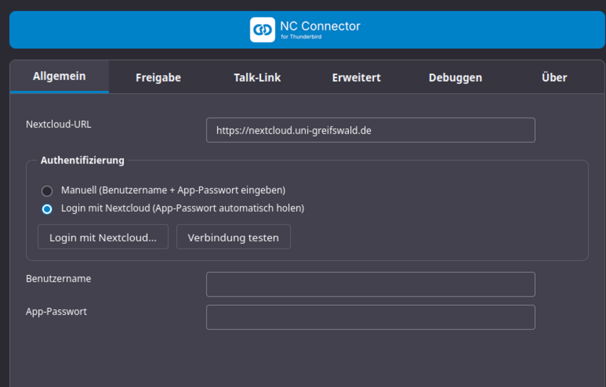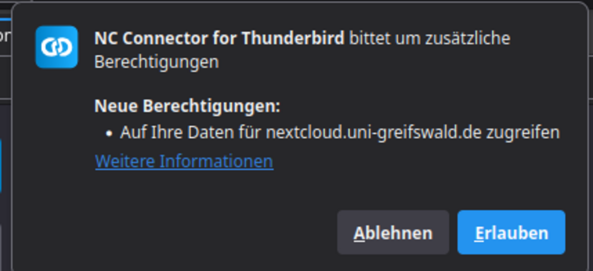 Unter Allgemein ist die Nextcloud-URL https://nextcloud.uni-greifswald.de zu setzen. Als Authentifizierungsmethode ist Login mit Nextcloud (App-Passwort automatisch laden) zu wählen. Beim Klick auf Login mit Nextcloud… fragt Thunderbird nach einer Bestätigung, dass das Plugin einen Browser öffnen darf. Dies ist zu bestätigen. Im Browserfenster muss dann ein Zugriff auf die Nextcloud gewährt werden.