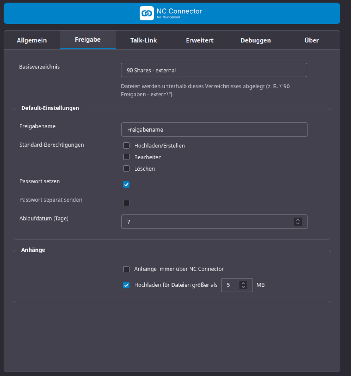 Damit ist die grundlegende Konfiguration abgeschlossen. Im Einstellungstab Freigabe können noch zusätzliche Einstellungen wie der zu nutzende Ordner, Einstellungen zur Freigabe und auch eine Grenze, ab wann Dokumente hochgeladen werden sollen, vorgenommen werden.