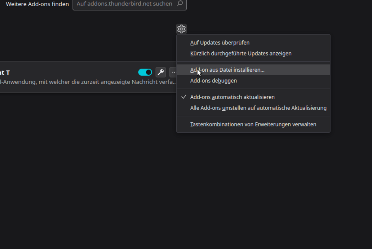 Die aktuellste Version ist direkt beim Entwickler als Download verfügbar. Bitte achten Sie darauf, mindestens die Version 3.0.3 (Rechtsklick → Ziel speichern unter…) zu verwenden, da diese einen Bug löst. Die heruntergeladene .xpi-Datei kann in Thunderbird über das Burger-Menü unter Add-Ons und Themes mit Klick auf das Zahnrad und den Menüpunkt Add-On aus Datei installieren geöffnet und installiert werden.