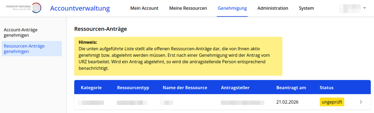 If you have been selected to approve a resource request, you will be notified by email. You can find pending approval requests in account management under My Resources => Resource Requests. Click on a request to approve or reject it.