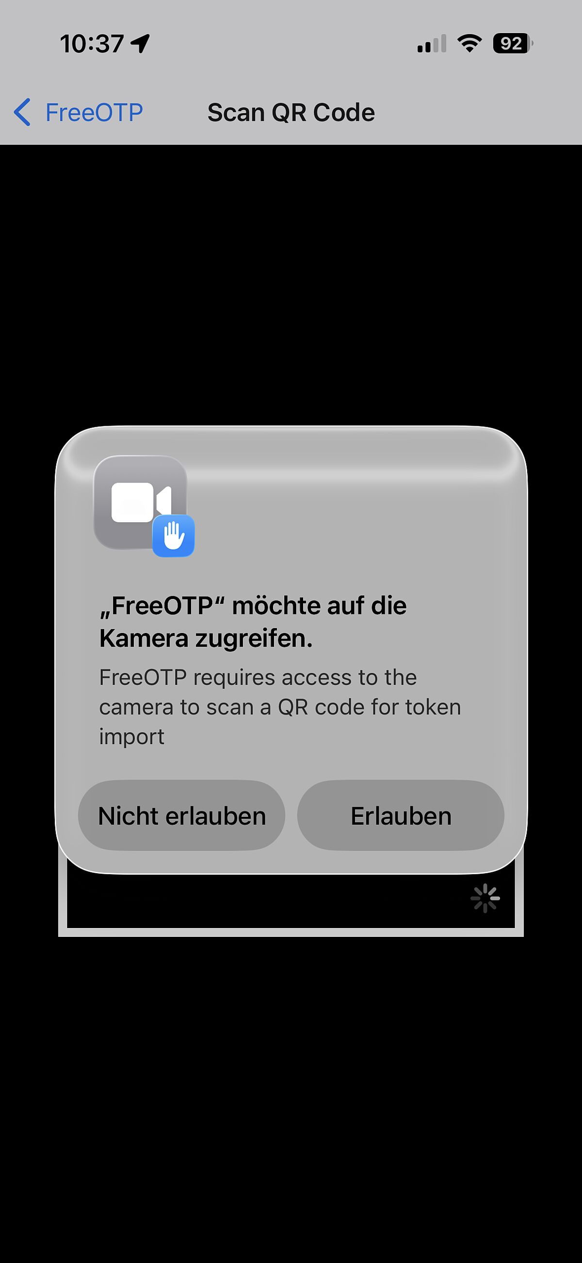 Um Einträge über einen QR-Code anlegen zu können, muss initial die Berechtigung zur Nutzung der Kamera gegeben werden. Je nach Betriebssystem erfolgt dies beim Start der App oder bei der Auswahl des QR-Codes.